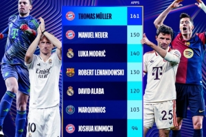 欧冠8强球员赛事出战场次top10:穆勒161场居首,诺伊尔150场次之