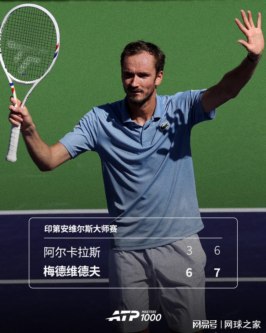 北京时间今天上午,梅德维德夫在印第安维尔斯半决赛中耗时1小时37分钟,以6-3 7-6(3)战胜了世界第一阿尔卡拉斯,终结了后者今年以来的16连胜纪录,也终结了自2023年年终总决赛以来对阵对手的四连败纪录。